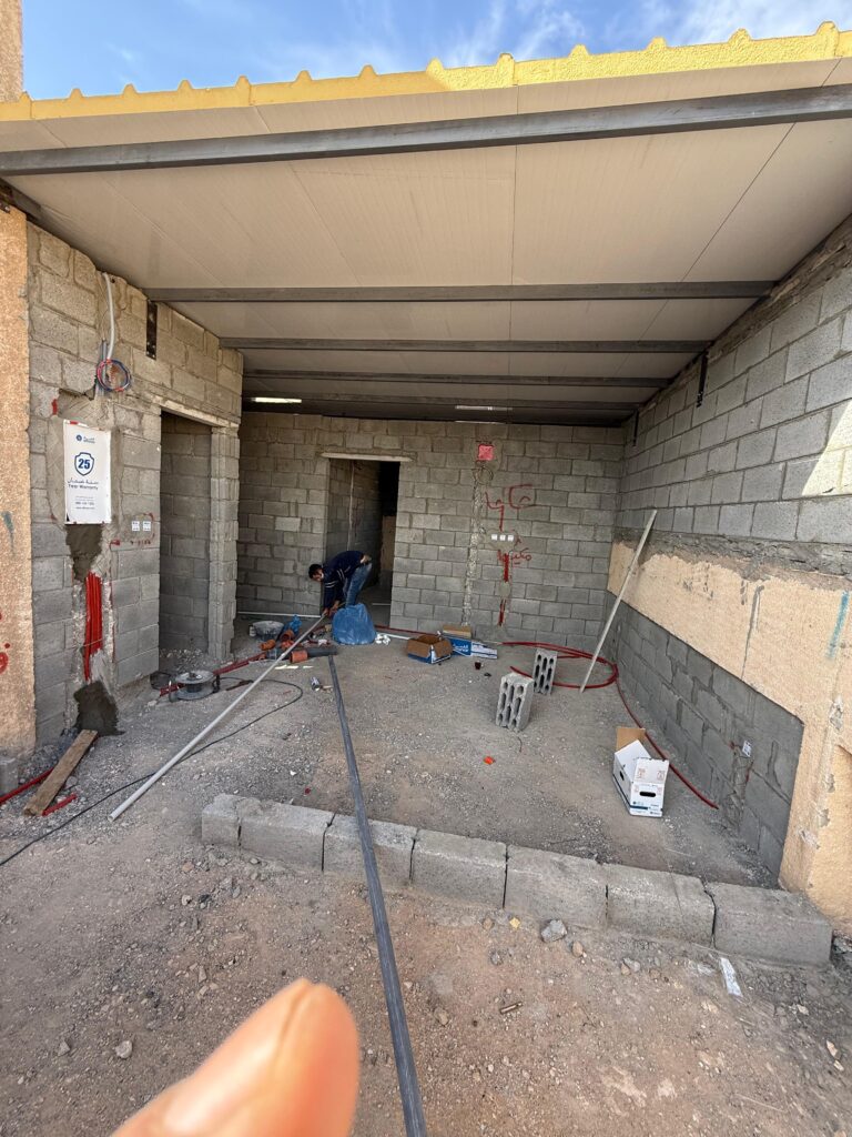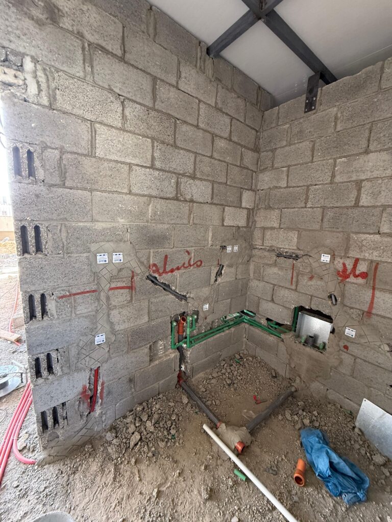 حفر الجدران وتمديد المواسير البلاستيكية قبل مرحلة الصب.